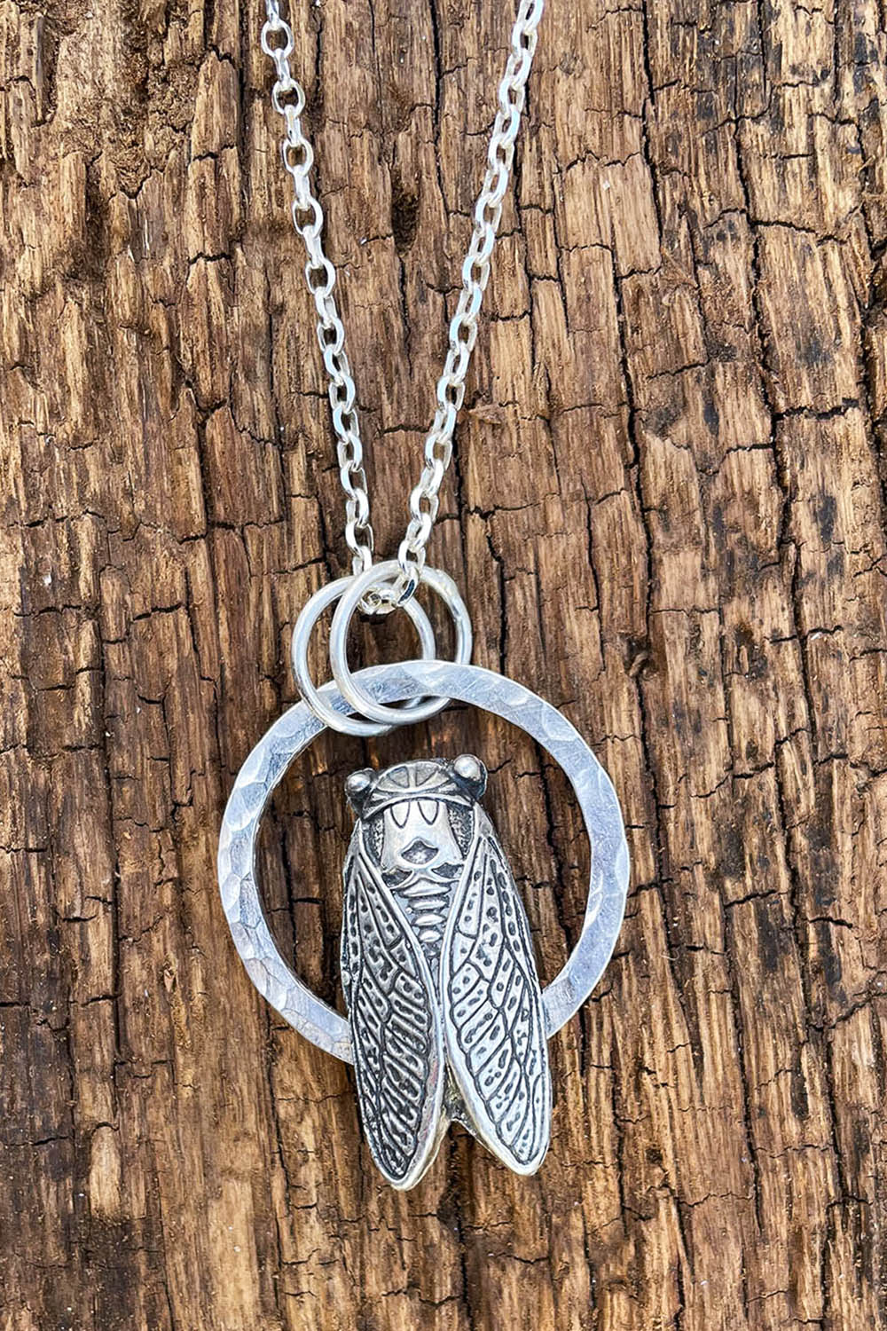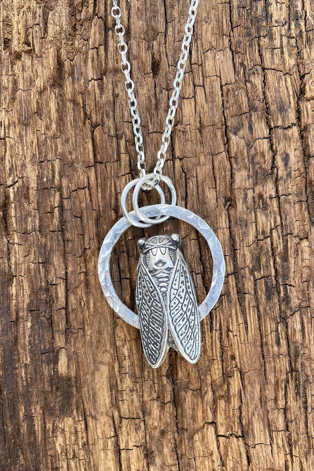 Sterling silver cicada casting set in a sterling silver circle.
