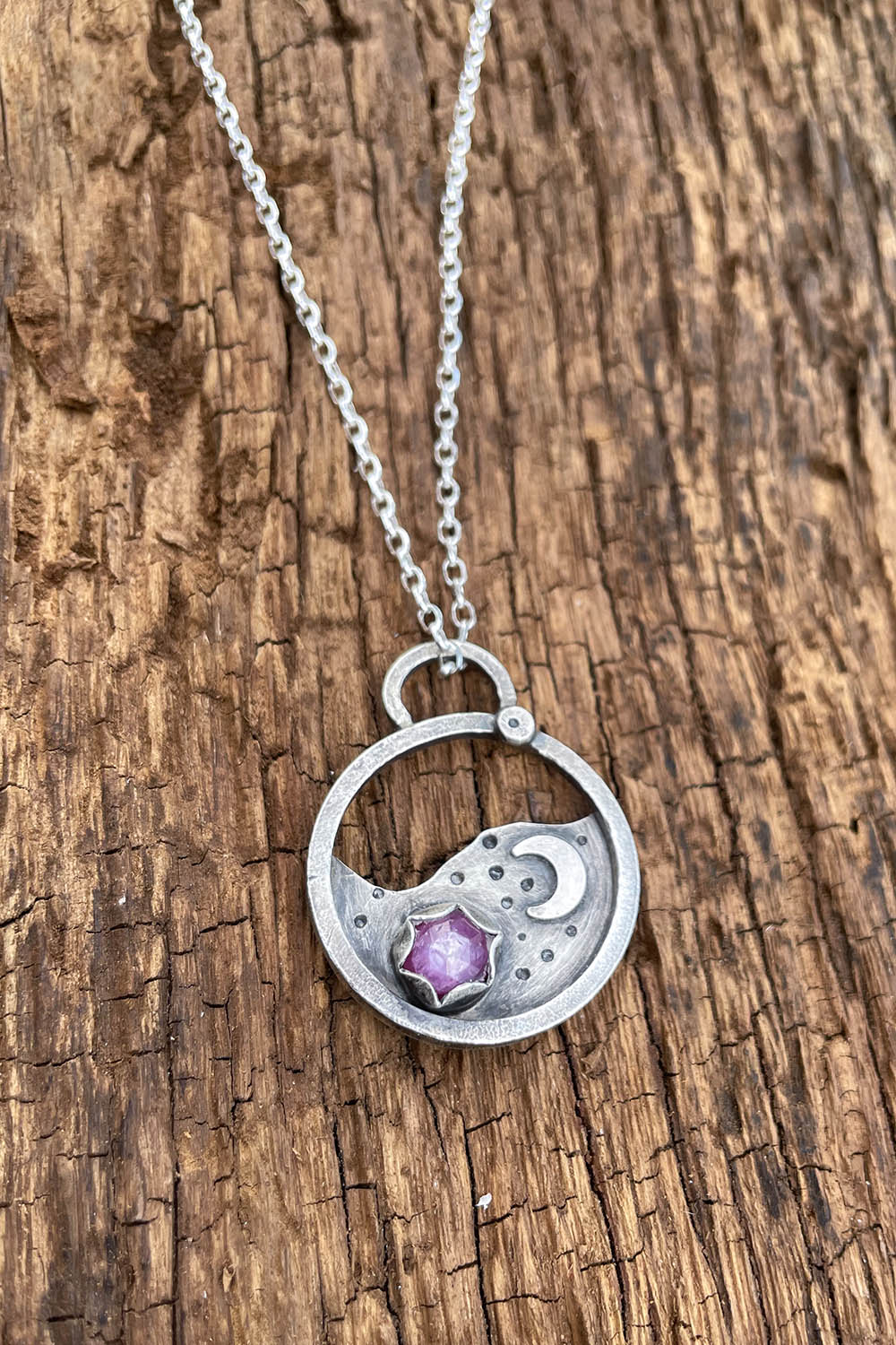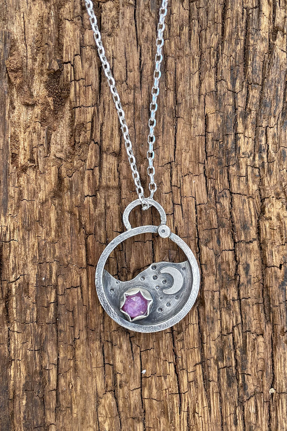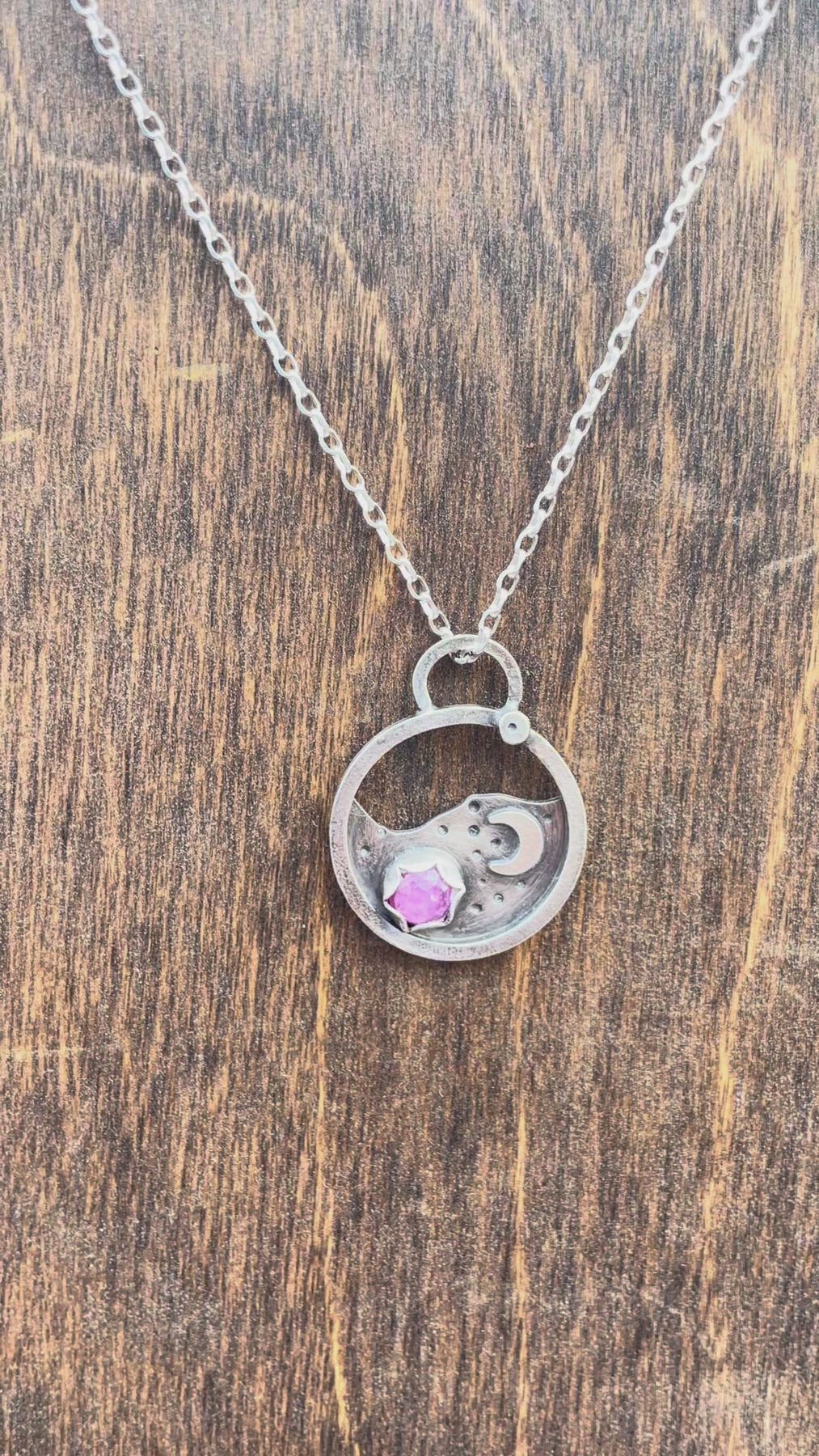 Ruby stone set in sterling silver. This nightly scene necklace is perfect for those born in July as Ruby is July's birthstone.